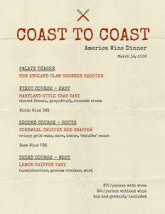 Join us for March’s Wine Dinner; we are doing coast-to-coast America! Once again, you may purchase dinner with or without wine. We will pair the two main courses with wine, if you choose this option. Light hors d’oeuvres followed by two courses and dessert. The doors will open at 6:00. Please join us as a group, as a couple or by yourself!